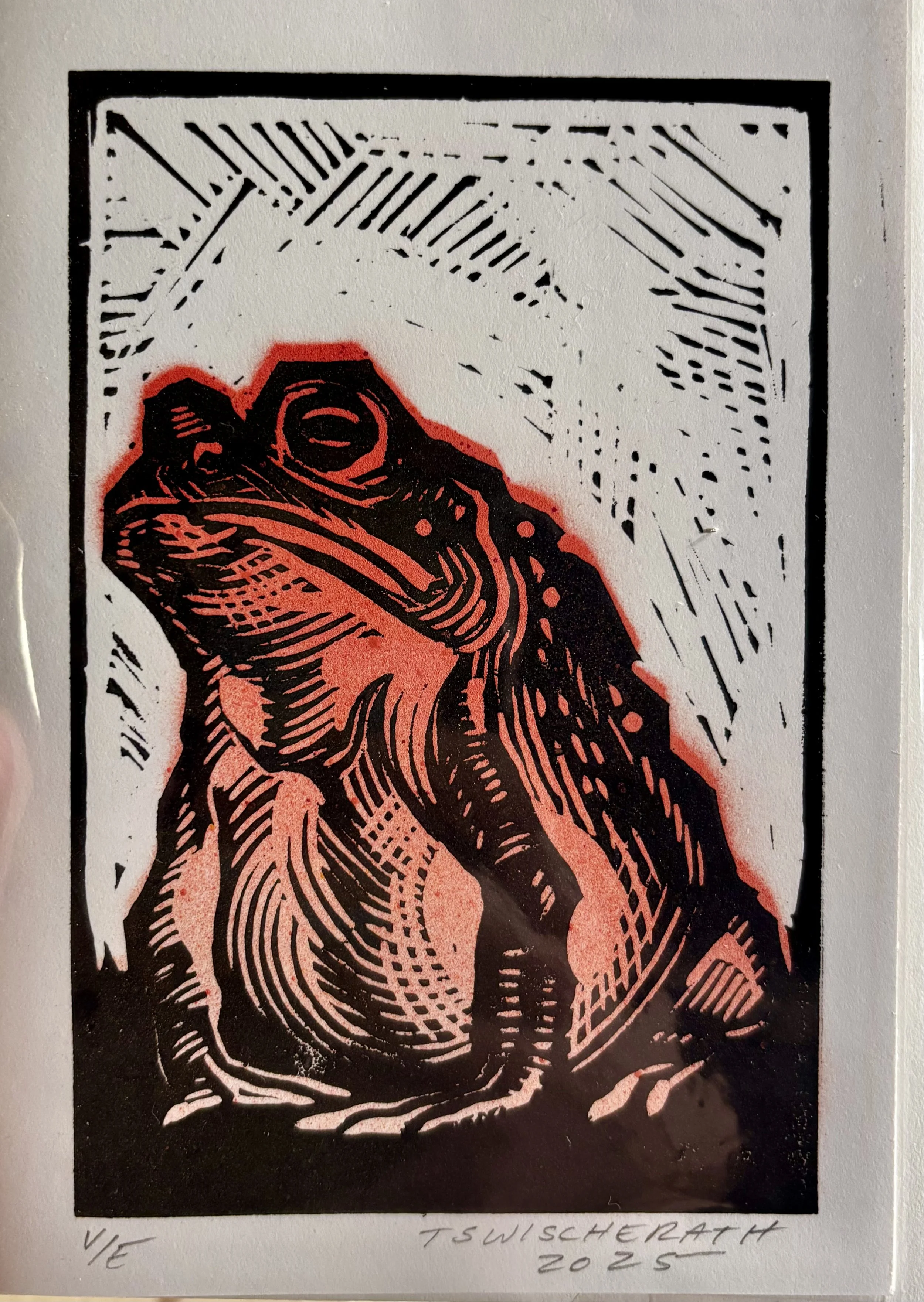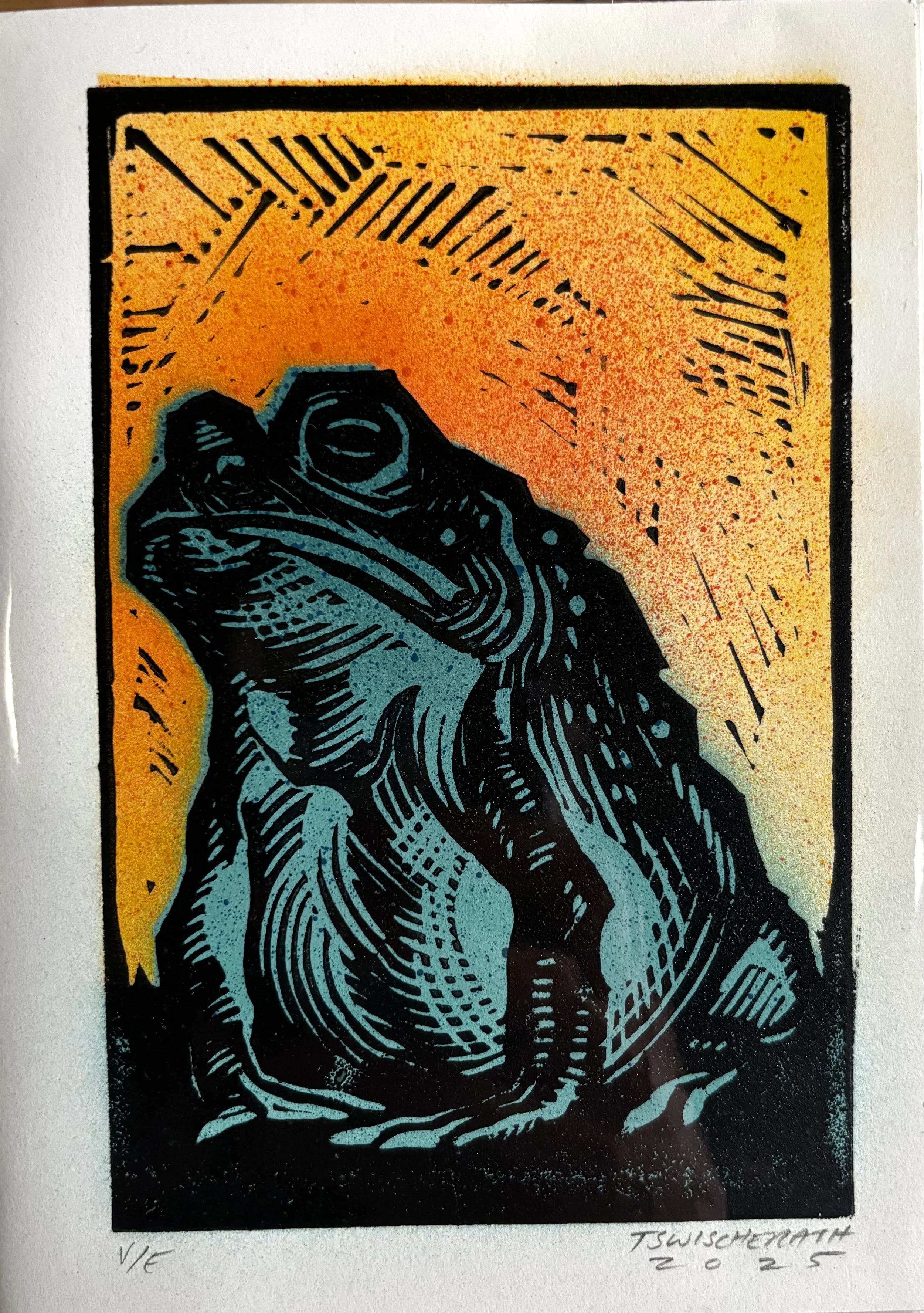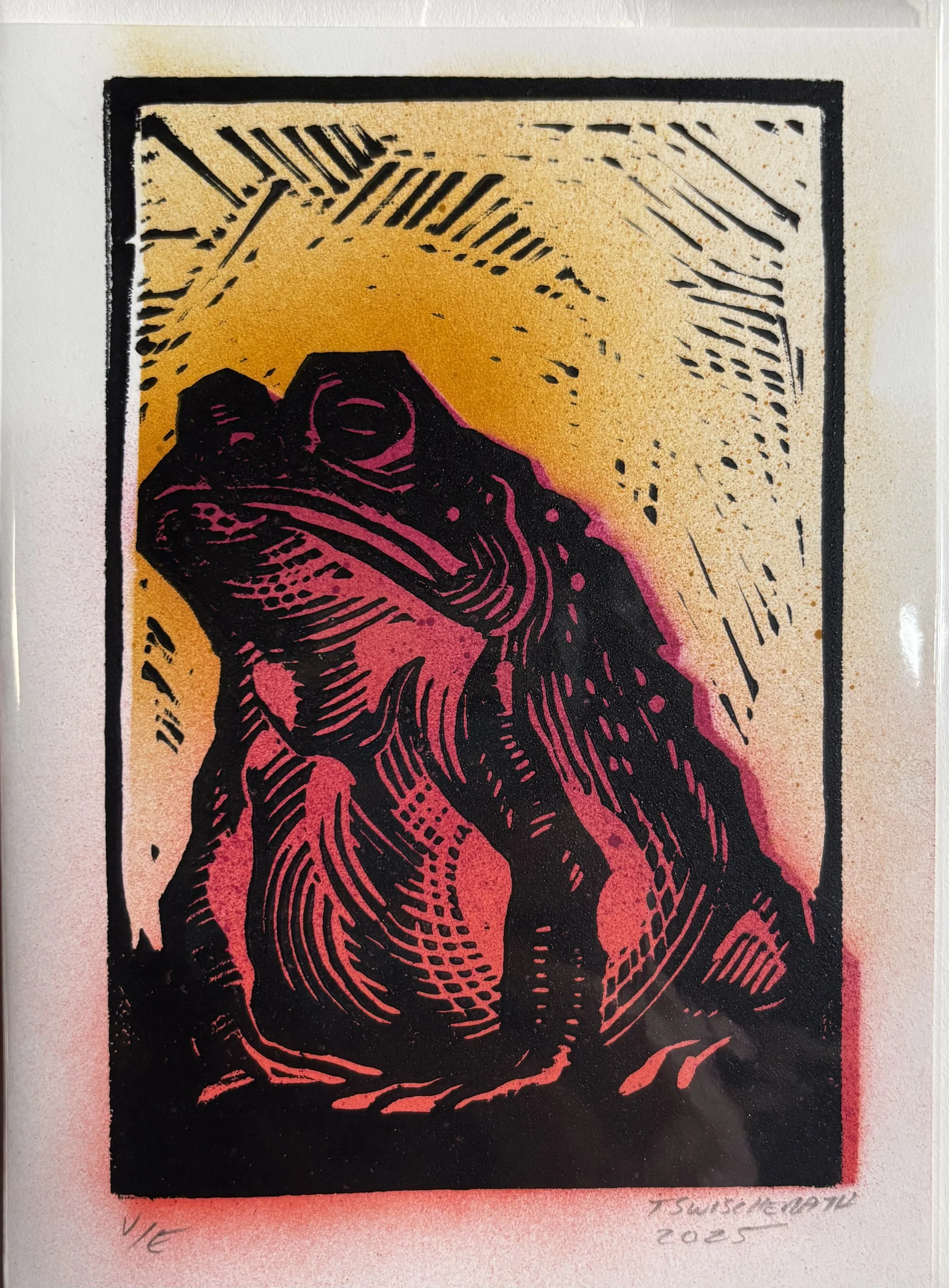 Painting- “The Fruiting Season” $2,800.00 Painting- “ The Horrors” $800.00 Daddy Toad Print $12.00 Grand Toad Card. $12.00 “So Hoppy With You” Print $12.00